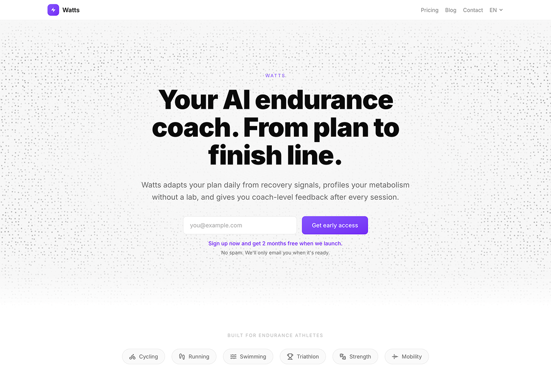 An AI-powered endurance coaching app for cyclists and runners. Watts analyzes your training data and builds personalized plans to help you reach your goals. Check it out at getwatts.app.